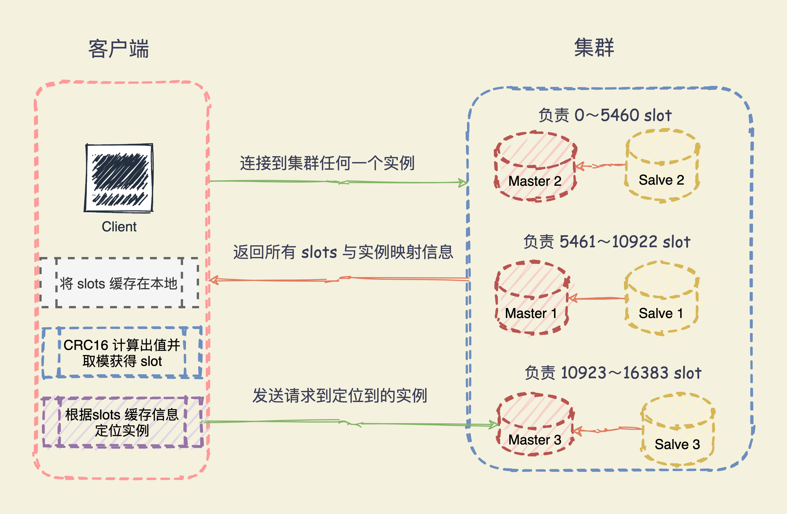 当客户端请求时,会计算出键所对应的哈希槽,再通过本地缓存的哈希槽实例映射信息定位到数据所在实例上,再将请求发送给对应的实例。