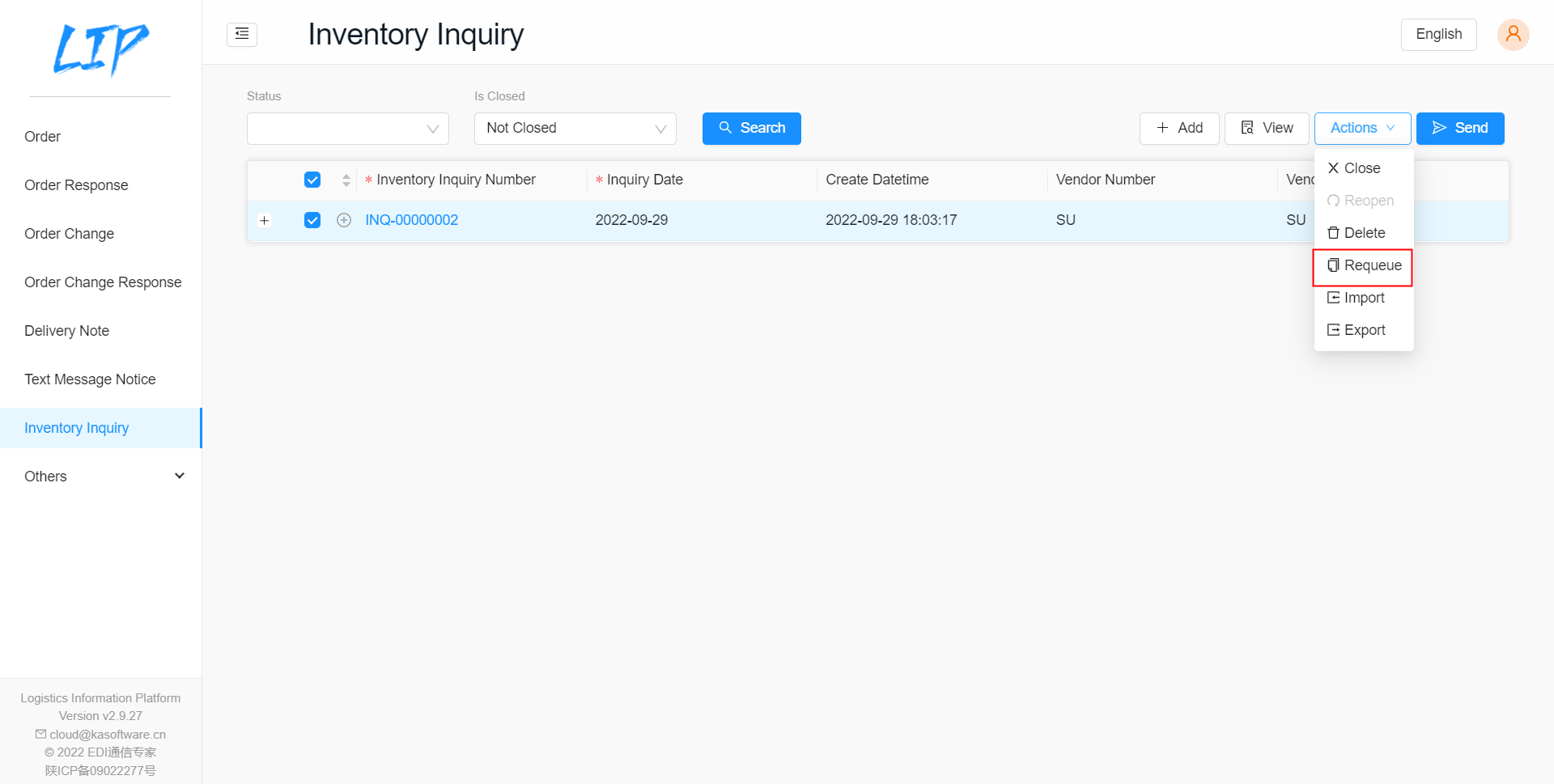 Target DVS 的知行之云 LIP 系统中,主要包含7个与其 EDI 需求匹配的业务模块:订单(Order)、订单回复(Order Response)、订单变更(Order Change)、订单变更回复(Order Change Response)、发货通知(Delivery Note)、库存报告(Inventory Inquiry)、文本消息通知(Text Message Notice)。知行之云 LIP 系统支持中文、英文两种语言,可任意切换,我们接下来将以英文界面按照实际业务流程来介绍如何操作使用 Target DVS 的知行之云 LIP 系统。以下介绍中将简称 “Target DVS 的知行之云 LIP 系统”为 LIP。