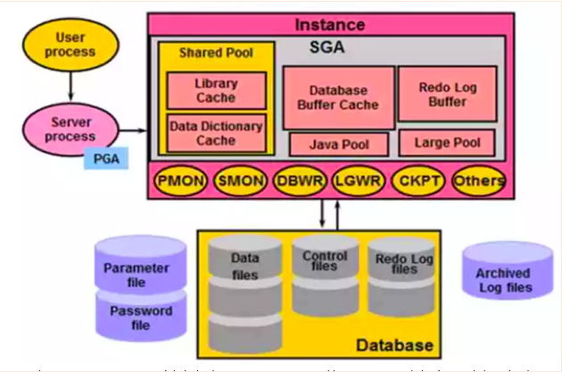 Oracle Server包括数据库(Database)和实例(Instance)两大部分,两者相互独立。数据库由数据文件 、控制文件和日志文件组成,实例由内存池和后台进程组成,示意图如下: