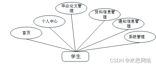 学生登陆后,主要模块包括首页、个人中心、毕业论文管理、资料信息管理、通知信息管理、系统管理等功能。学生用例图如图3-2所示。