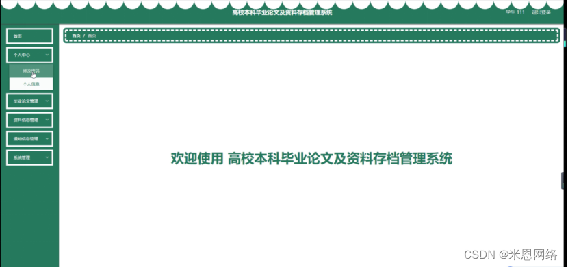 学生登录进入系统可以对首页、个人中心、毕业论文管理、资料信息管理、通知信息管理、系统管理等功能进行相应操作,如图5-9所示。