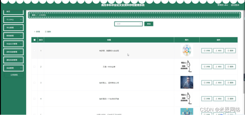系统管理,在公告资讯页面可以对索引、标题、图片等内容进行详情,修改和删除等操作;如图5-8所示。