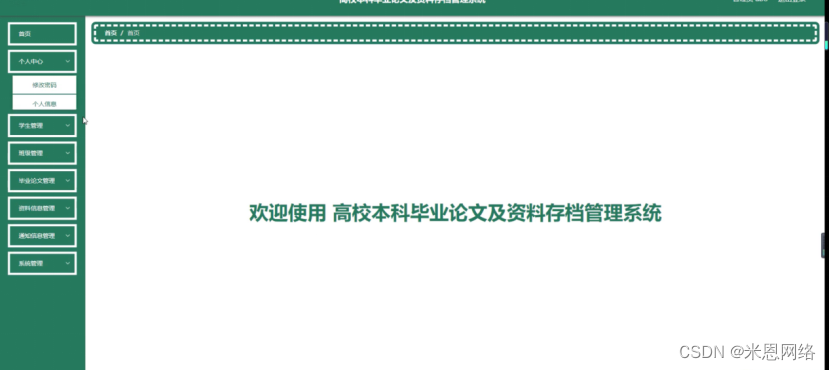 管理员登录系统后,可以对首页、个人中心、学生管理、班级管理、毕业论文管理、资料信息管理、通知信息管理、系统管理等功能进行相应的操作管理,如图5-2所示。