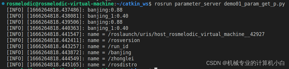 banjing是之前添加的参数服务器参数,所以能读取到键值,banjing_1为不存在的键名,故其键值由于get_param函数的第二个参数,取默认值0.40。
