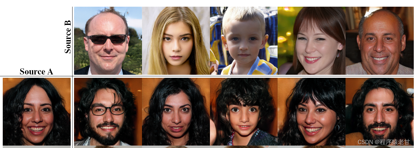 为了理解这个过程,我们重新审视AdaIN在生成器中的作用。AdaIN归一化每一个通道,变成均值与单位方差,仅应用基于风格的尺度和偏差,以修改相对重要的属性,用于之后的卷积计算。这个过程由于归一化,使得其数据不依赖于原始的分布。因此,每种风格在被下一个AdaIN操作覆盖之前只控制一个卷积。这段话是翻译自原文,我的理解就是实现对风格的解耦。一个合理的推论是,既然风格是能够被解耦并被部分应用于图像生成,那么混合风格是一个很自然的事情。作者提出了混合风格的概念。这里引入两个隐空间编码z1和z2,通过映射网络,就能够得到w1和w2。之后,在将w1和w2按照顺序输入到合成网络对应的位置,即实现了风格混合。下图是按照不同的混合级别混合A与B所建立的生成图片矩阵: