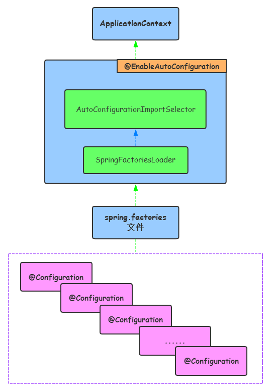 @EnableAutoConfiguration 注解启用自动配置,其可以帮助 SpringBoot 应用将所有符合条件的 @Configuration 配置都加载到当前 IoC 容器之中,可以简要用图形示意如下: