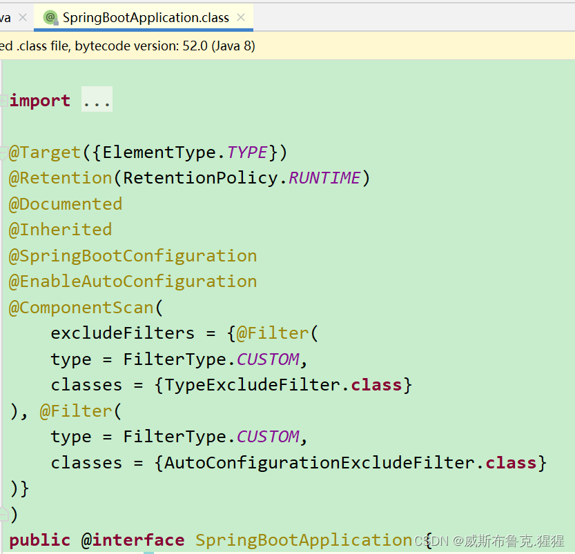 @SpringBootApplication注解实际上是SpringBoot提供的一个复合注解,看源码: