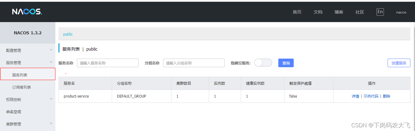 打开浏览器输入http://localhost:8848/nacos,即可访问服务, 默认密码是nacos/nacos
