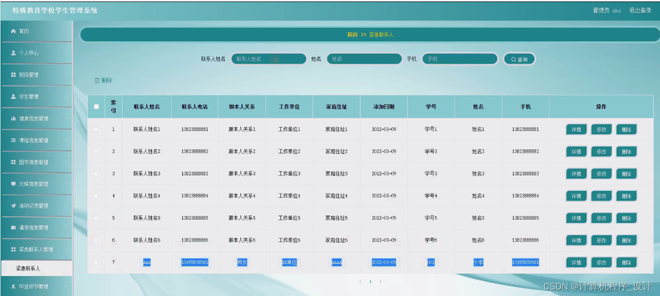 紧急联系人管理,管理员可在紧急联系人管理页面查看联系人姓名、联系人电话、跟本人关系、工作单位、家庭住址、学号、姓名、手机等内容,还可进行修改或删除等操作,如图5-10所示。