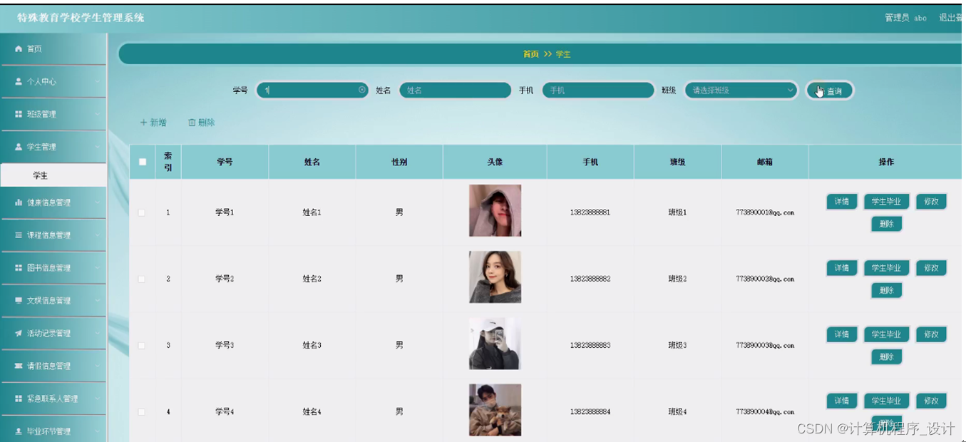学生管理,管理员可在学生管理页面查看学号、姓名、性别、头像、手机、班级、邮箱等内容,还可进行新增、修改或删除等操作,如图5-4所示。