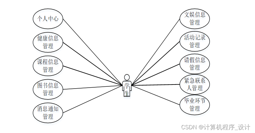 学生进入系统后,主要模块包括个人中心、课程信息管理、健康信息管理、图书信息管理、文娱信息管理、活动记录管理、请假信息管理、紧急联系人管理、毕业环节管理、消息通知管理等功能。学生用例图如图3-2所示。