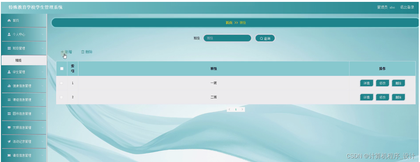 班级管理,管理员可在班级管理页面通过输入班级进行查询、新增、修改或删除等操作,如图5-3所示。