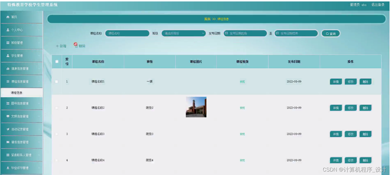 课程信息管理,管理员可在课程信息管理页面查看课程名称、班级、课程图片、课程视频、发布日期等内容,还可进行新增、修改或删除等操作,如图5-6所示。