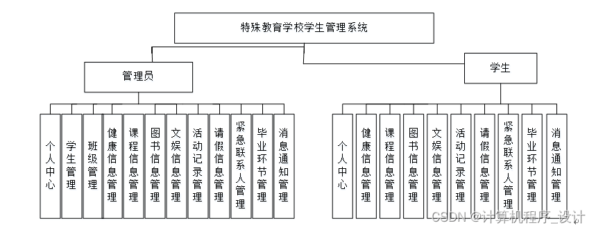 考虑到实际生活中在特殊教育学校学生管理方面的需要以及对该系统认真的分析,将系统权限按管理员和学生这二类涉及用户划分。