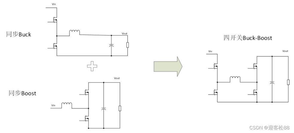 同时,如果我们把同步Buck拓扑串联同步Boost可以形成四开关Buck-Boost拓扑,如下图所示。
