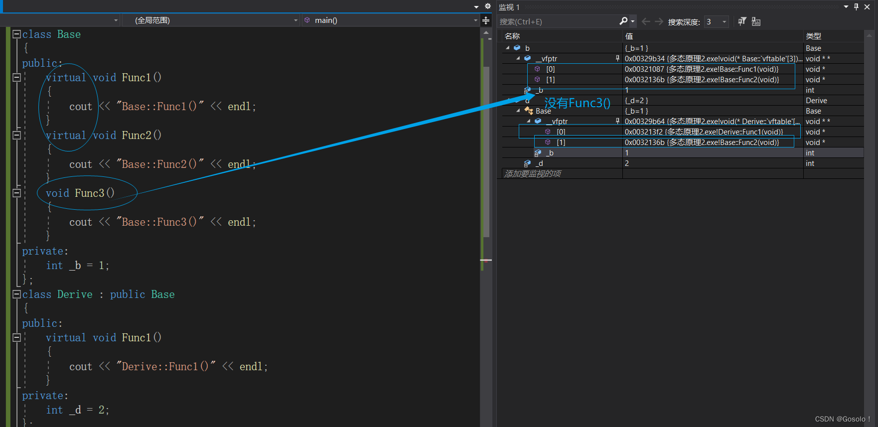 在VS2019版本中没有重写的虚函数,也可以通过监视窗口看到了