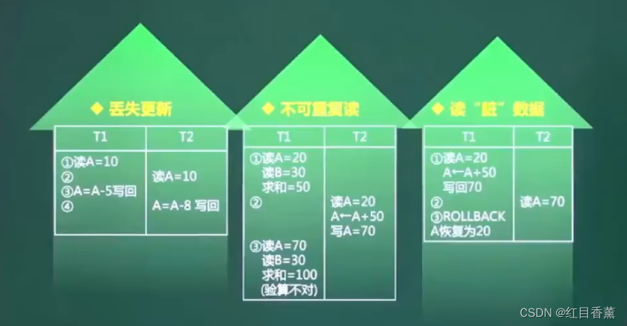 丢失更新、不可重复读、读“脏”数据。
