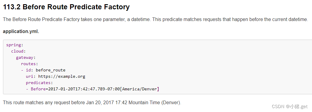 Before断言有一个参数,一个datetime(其是Java ZonedDateTime)。该断言匹配在指定之前发生的请求datetime。以下示例配置了路由前断言