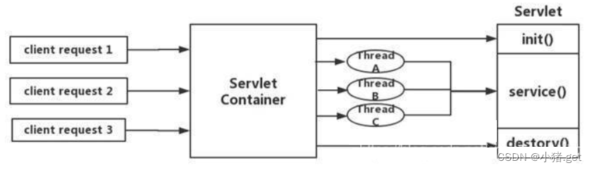- container运行时接受请求,并为每个请求分配一个线程(一般从线程池中获取空闲线程)然后调用service()。