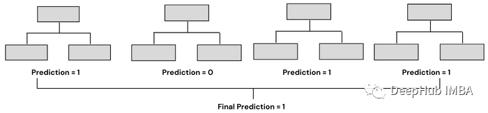 在回归问题中,它的工作方式有些不同,因为我们不是寻找频率最高的类,而是采用每个模型的预测并计算它们的平均值,从而得出最终的预测。