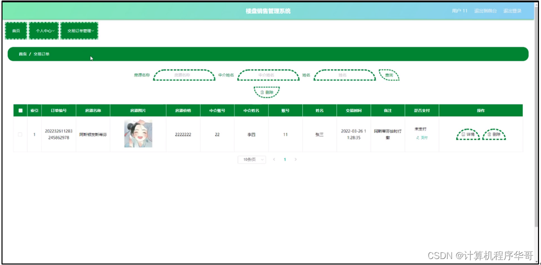 交易订单管理;在交易订单管理页面可以对索引,订单编号,房源名称,房源图片,房源价格,中介账号,中介姓名,账号,姓名,交易时间,备注,是否支付等内容进行详情或删除等操作,如图5-14所示。