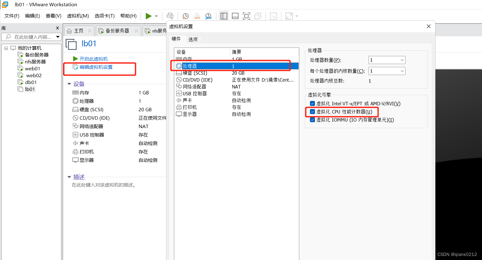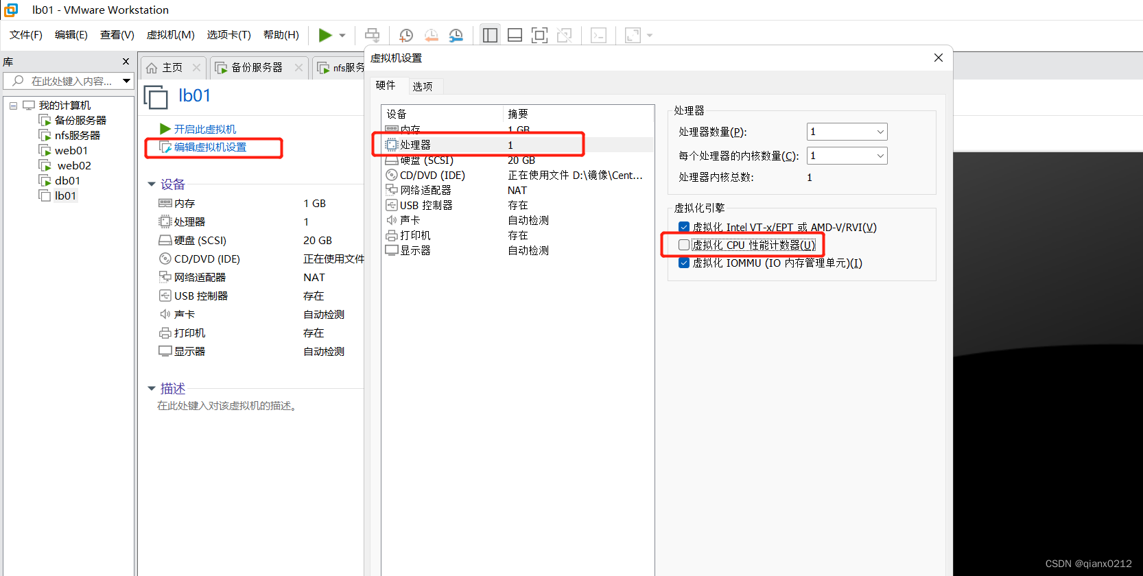 2)、编辑-> 处理器 设置 , 然后将 " 虚拟化 CPU 性能计数器 " 的勾选去掉