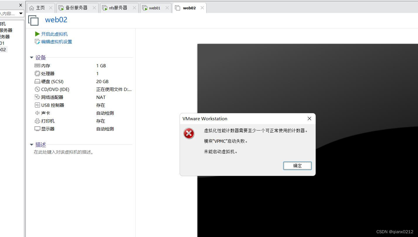 问题:今天使用VMware开启centos7.9发现不能正常启动报错截图: