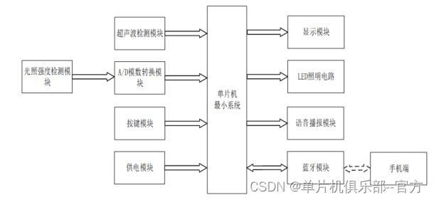 本设计以单片机为核心控制器,加上其他模块一起组成此次设计台灯的整个系统,其中包括中控部分、输入部分和输出部分。中控部分采用了单片机控制器,其主要作用是获取输入部分的数据,经过内部处理,逻辑判断,最终控制输出部分。输入由四部分组成,第一部分是超声波检测模块,通过该模块检测人的距离;第二部分是光照强度检测模块,通过该模块可以检测当前的光照强度;第三部分是按键模块,通过该模块可以切换界面、设置阈值、切换模式等;第四部分是供电模块,通过该模块可给整个系统进行供电。输出由四部分组成,第一部分是显示模块,通过该模块可以显示监测的数据以及设置的阈值;第二部分是LED灯照明电路;第三部分是语音播报模块,检测到用户距离台灯距离较近进行语音播报提醒。除此之外,蓝牙模块既作为输入又作为输出,蓝牙模块和手机进行连接,可以将监测的数据传输到用户手机端,用户也可以通过手机端发送指令控制继电器的工作及其模式的切换。具体系统框图如图所示。