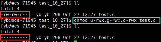 也可通过“ , ”同时进行多组操作,如:chmod u-rwx,g+w,o-x test.txt