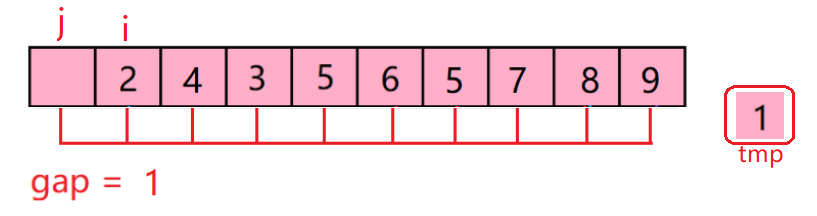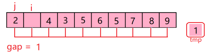 i 变量指向这一组的第二个数据, j 变量指向 i - gap 的位置。