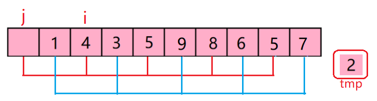 j 变量此时在-2下标处,要将 tmp 的值放到 j + 2的位置。