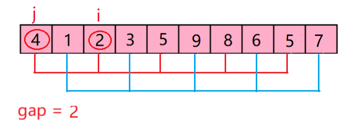 此时 gap 为2,数据此时分为了两组。第一组由红色线画出(4、2、5、8、5),第二组由蓝色线画出(1、3、9、6、7)。