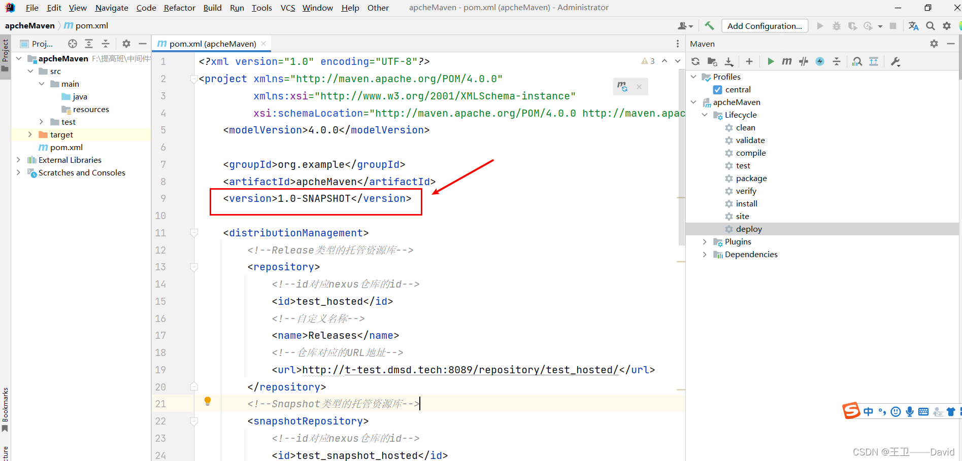 注意:由于pom.xml文件的1.0-SNAPSHOT中以SNAPSHOT为后缀,最终会上传test_snapshot_hosted资源库中