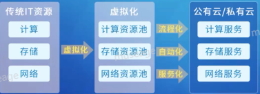 虚拟化:将传统IT资源逻辑化,不再直接使用,通过Hypervisor层,以虚拟机的形式,将计算、存储以及网络等资源重新组织,