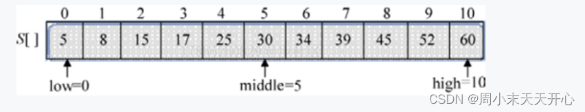 (2) 初始化。令low = 0、high = 10, 计算 middle=(low+high)/2=5 , 如下图所示。