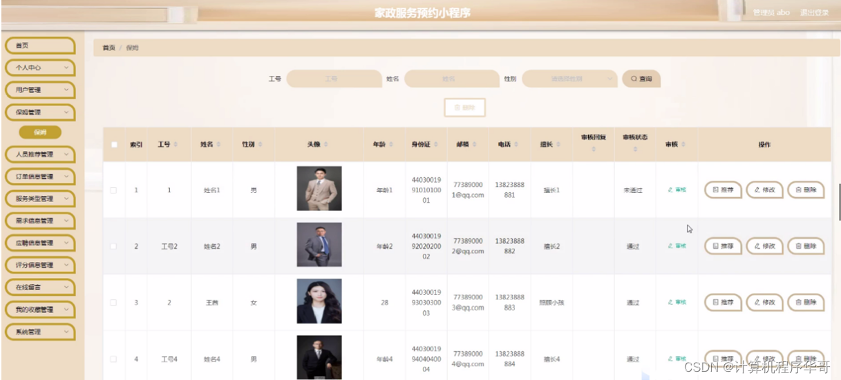 保姆管理,在保姆管理页面可以查看工号、姓名、性别、头像、年龄、身份证、邮箱、电话、擅长、审核回复、审核状态、审核等信息,并可根据需要对保姆管理进行修改或删除等操作,如图5-4所示。