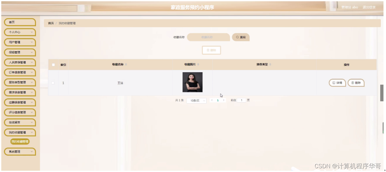 我的收藏管理,在我的收藏管理页面可以查看收藏名称、收藏图片、推荐类型等信息,并可根据需要对我的收藏管理进行详情,修改或删除等操作,如图5-11所示。