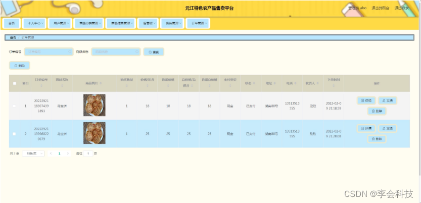 前台功能:用户进入系统可以实现首页,商品信息,特产公告,留言板,个人中心,后台管理,购物车,在线客服等内容进行操作;