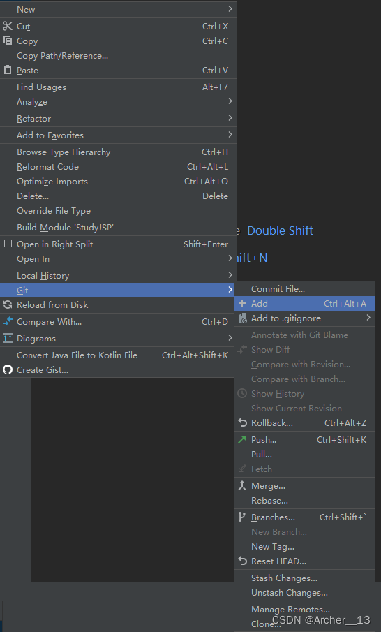 右键选中文件 ----> Git -----> Add