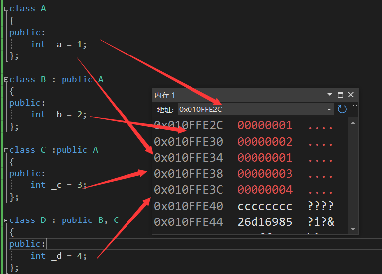 对于B类域的虚基表中偏移量14,B类域虚基表指针此时所在的地址为0xcdfcb4加上14时就可以发现刚好等于0xcdfcc8不就是_a在内存窗口的位置吗。同理,对于C类域中虚基表的偏移量加上对应的地址也可以找到。