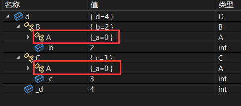 可以看到,变量属性窗口和菱形继承类似,因为vs编译器进行了处理,那么我们这里不妨直接看内存窗口,可以和菱形继承的内存窗口相比,会发现在原本的B类域和C类域继承的A类属性_a的值换成了一个地址,而保留_a的在整个内存的最下面。