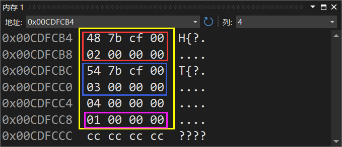 按理来说,这两个指针应该指向下面_a的地址(0x00CDFCC8)可是转入指针查看发现结果并不是我们想的那样,而是第一行是一个0,往下走4个字节会存在一个偏移值。