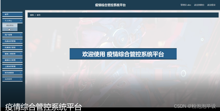 管理员登录系统后,可以对首页,个人中心,用户管理,机票信息管理,机票预定管理,健康上报管理,健康状态管理,上报信息管理,留言板管理,系统管理等进行相应的操作管理,如图5-7所示。