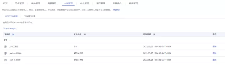 7、选择“文件管理 > HDFS文件列表”,在“/tmp/teragen”路径下查看到新生成的文件。