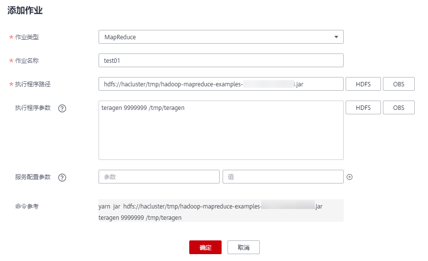 执行程序路径:单击“HDFS”,并选择待执行的jar文件。例如:hdfs://hacluster/tmp/hadoop-mapreduce-examples-xxx.jar(此处以hadoop example程序为例,已提前将jar包上传至HDFS)