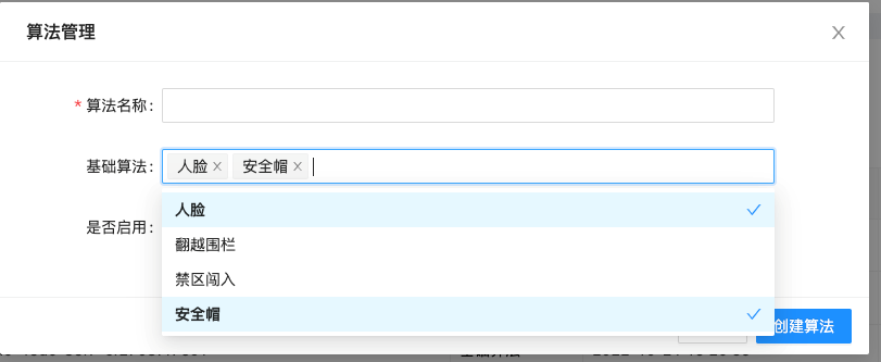 智能分析网关(V1)目前的基础算法有四种(人脸、安全帽、翻越围栏、禁区闯入),用户可以根据自己的需求创建算法模型、自由组合算法。例如:智慧工地模型可以选择人脸检测和安全帽检测等基础算法进行组合。