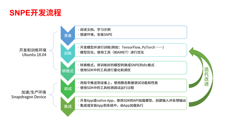 而我们继续在思考,仅仅有硬件框架还不够,如何在这样一套硬件框架上使客户能高效低研发成本的引入AI能力,从单纯连接类硬件向智能化硬件升级?因此,美格智能将研发继续向前一步,物联网定制化解决方案基于高通神经网络处理引擎(SNPE),支持Caffe、TensorFlow、TFLite、ONNX、PyTorch和Caffe2等模型、API和可嵌入App的执行库,AI研发人员可以选择使用自己熟悉的框架设计和训练网络,快捷高效的完成AI对于各类终端产品的技术赋能。开发流程如下:
