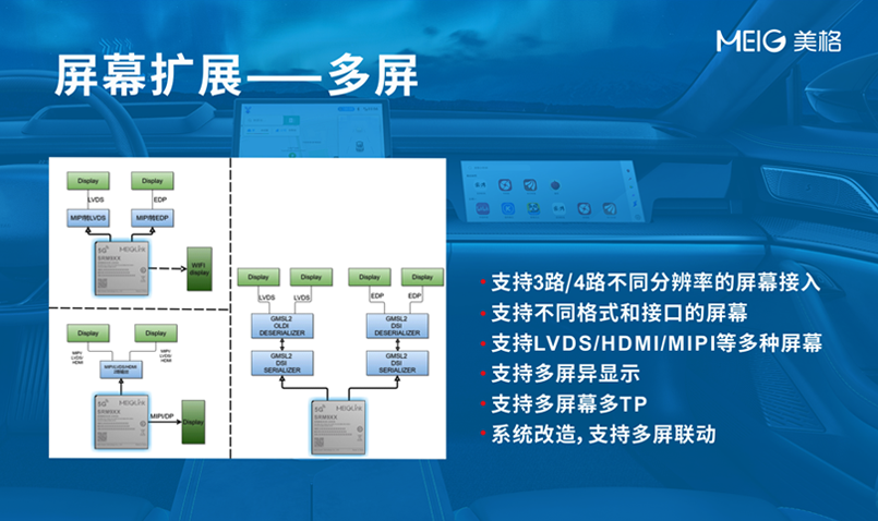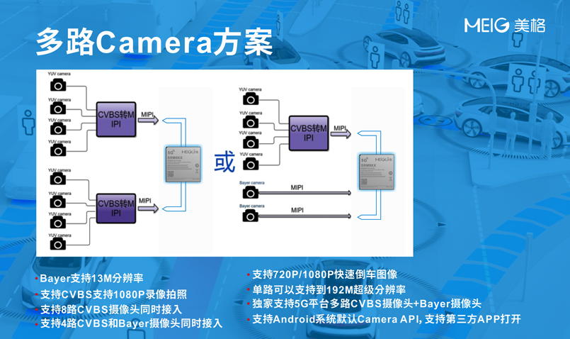 以AI能力覆盖0.2T到30T的智能模组为基础,为助力客户在不同模组基础上快速开发出一系列智能化设备,美格智能将研发继续向前一步,在模组基础上提供针对行业及各类外接感知设备的完整解决方案。以最常见的感知硬件摄像头和屏幕来讲,摄像头如同人的眼睛,负责信息录入,而屏幕如同嘴巴,负责输出信息,因此美格智能自研了一套多屏多摄像头架构图,为设备的视觉能力搭建最基础的硬件框架,便于各类客户在此硬件框架上直接开展终端产品和应用开发。