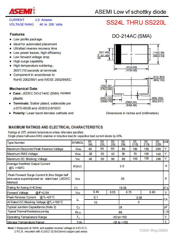 ASEMI肖特基二极管SS210L参数: