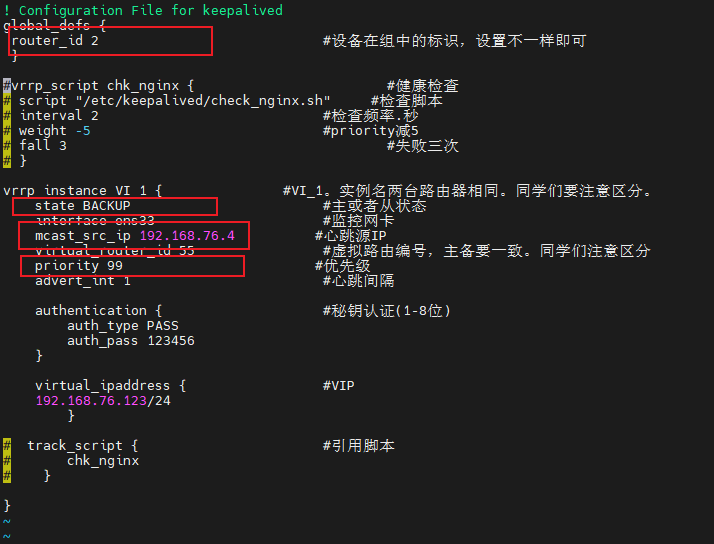 - mcast_src_ip 192.168.76.3 #心跳源IP